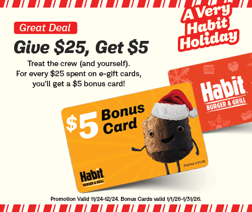 Give $25, Get $5. Treat the crew (and yourself). For every $25 spent on e-gift cards, you'll get a $5 bonus card! Promotion Valid 11/24-12/24. Bonus Cards valid 1/1/26-1/31/26.