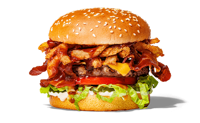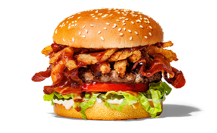 Freshly chargrilled beef patty topped with American cheese, hickory-smoked bacon, BBQ sauce, crispy onion tanglers, crisp lettuce, fresh tomato, pickles, and mayo on a toasted seeded bun.